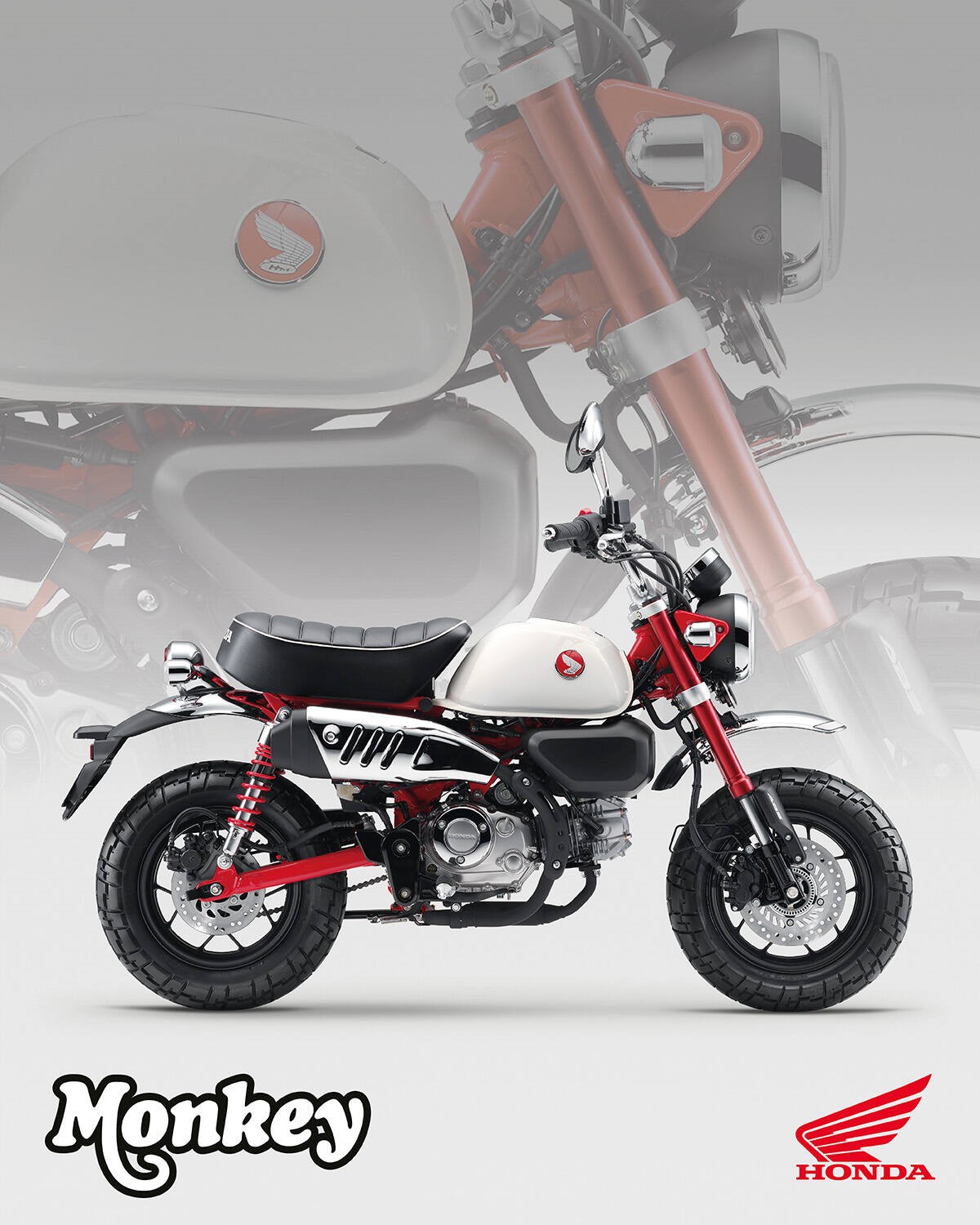 Pak je tu samozřejmě nenapodobitelný vzhled Monkey od charakteristických řídítek až po zvednutý výfuk. Vyvolává nakažlivý úsměv − u jezdce i u všech, které míjí. Exkluzivní příslušenství zahrnuje hodiny a ukazatel zařazeného rychlostního stupně, zadní nosič, konzole pro boční tašky, USB zásuvku a vyhřívané rukojeti.